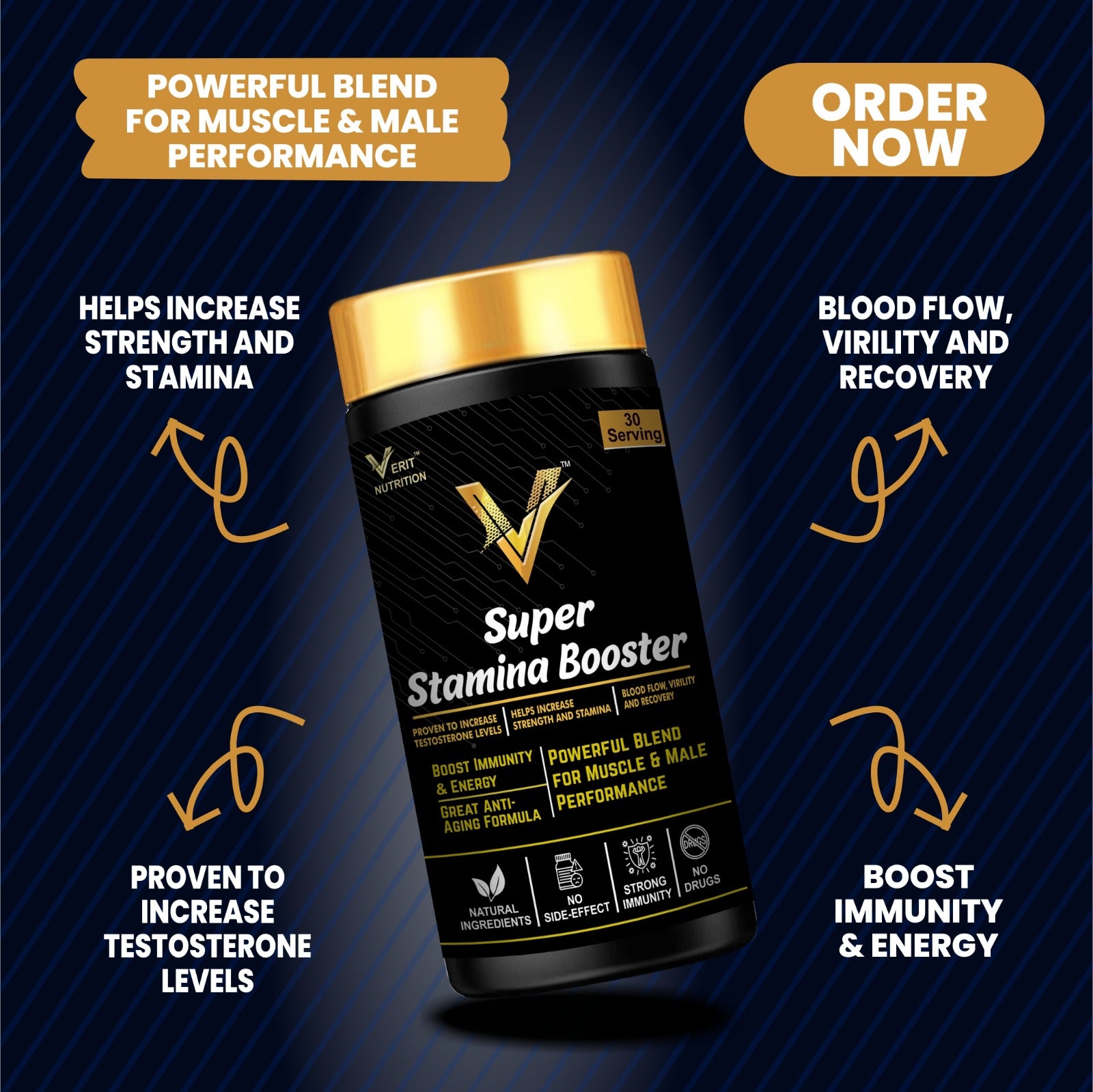 Verit Super testobooster is powered by the clinically studied ingredient that helps increase free and total testosterone in young males, and supports muscle strength, growth and Virility.